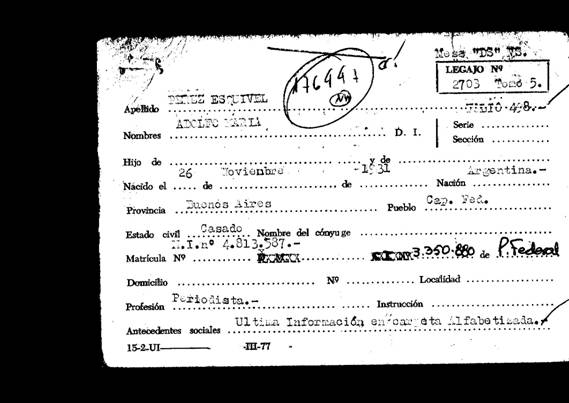 El archivo de la Dirección de Inteligencia de la Policía de la Provincia de Buenos Aires tiene tres fichas personales de Adolfo Pérez Esquivel, la primera de ellas no tiene fecha de elaboración y está registrada con el legajo N° 2703 del Tomo 5 de la mesa D S: “Delincuentes subversivos”. En el dorso de la ficha, impresos en mecanografía y a mano alzada, se señalan trece legajos; cada uno de ellos remite a una ubicación del archivo y a un informe de inteligencia sobre Pérez Esquivel.