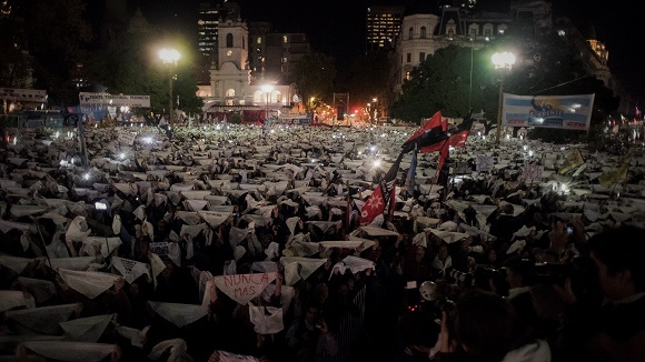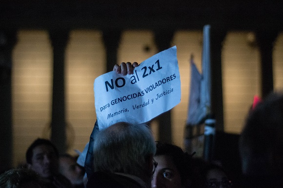 A las 18.40 hs. habla Taty Almeida y luego Nora Cortiñas, luego Lita Boitano. Hablan de la lucha que no se afloja contra el terrorismo de Estado, de la ronda de los pañuelos blancos. Hablan de la necesidad de la memoria, la verdad y la justicia para construir una sociedad mejor. “¡Madres de la Plaza, el pueblo las abraza!”, corea la multitud. Y ellas hablan del fallo que da privilegios a los genocidas, que instala el olvido y la mentira y que abre la puerta a la impunidad. “Señores jueces: Nunca más”, dicen. Y nombran y repudian a los jueces del fallo: Elena Highton de Nolasco, Carlos Rosenkrantz y Horacio Rosatti. Piden sus renuncias. Y que renuncie también el secretario de Derechos Humanos Claudio Avruj, por acordar con este fallo de la impunidad y relativizar -como Lopérfido- la cifra de los treinta mil. “Treinta mil detenidos desaparecidos, presentes. Ahora y siempre”, grita la gente y se estremece el mar. Habla Estela Carlotto, de Abuelas de Plaza de Mayo, dice que con este fallo los apropiadores de nietos, los torturadores, los autores de los vuelos de la muerte están pidiendo su libertad. “Olé, olé. Olé, olá”, corea la multitud. “Como a los nazis / les va a pasar / a donde vayan los iremos a buscar. Olé, olé. Olé, olá”. Las Madres sonríen dicen que gracias a la rápida reacción del pueblo, el Congreso y Poder Judicial neutralizarán el fallo. Dicen que afortunadamente la lucha no es como antes -cuando las llamaban Las Locas de la Plaza-, ahora estamos acompañadas por ustedes. “El pueblo / unido / jamás será vencido”, corea la gente. Y Carlotto propone: “Levantemos los pañuelos por los 30.000 detenidos desaparecidos”. Ocurre entonces lo inefable. Los pañuelos blancos son como crestas en el mar de gente. Hay un clamor desde las profundidades, comunicación, movimientos, una danza, y una entrega de amor entre pañuelos -como ocurre en la zamba-. “Nosotras, las Madres, los abrazamos a ustedes”, dice Taty Almeida. Y el pueblo toma la lucha por la memoria, la verdad y la justicia.