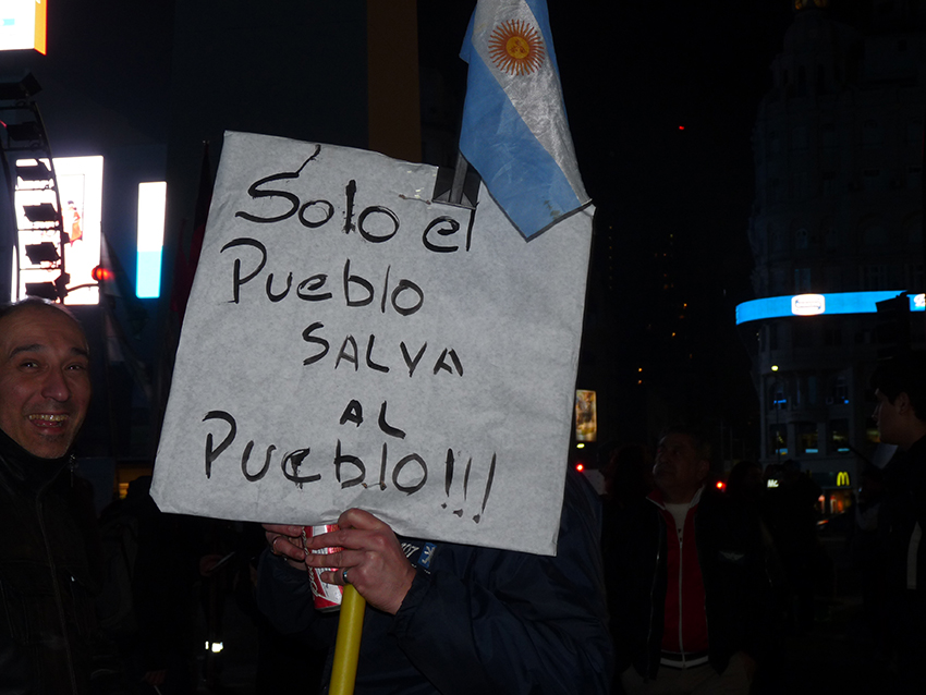 “Sólo el pueblo salva al pueblo” rezaba otro de los carteles. En tanto, un hombre enfundado en la bandera argentina y con un sartén de aceite pedía que bajara el precio de este producto, que al igual que la manteca, subió en forma considerable este último mes.
