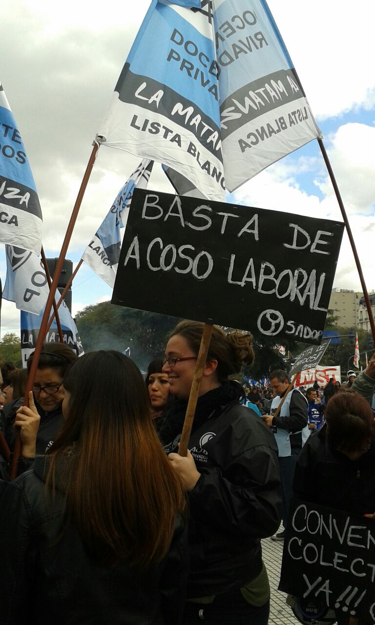 Junto a la protesta por el aumento de tarifas de los servicios públicos y los despidos, la situación judicial de la líder de la organización Tupac Amaru, Milagro Sala, fue un punto recurrente en los discursos de los oradores y varios dirigentes se colgaron carteles con la foto de la diputada del Parlasur en reclamo de su “inmediata liberación”.