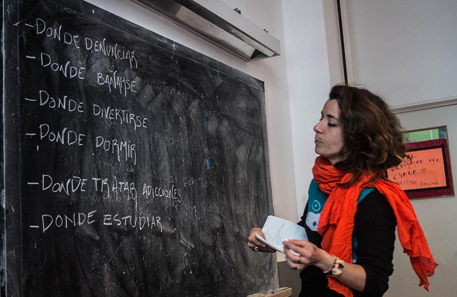 El aula del 3º ciclo tiene la misma calidez que la anterior. Martina anota preguntas en el pizarrón: ¿en qué lugares se pueden hacer denuncias?, ¿en dónde pueden buscar refugio?, ¿adónde asistir ante determinadas circunstancias? Selva, responde todo con precisión. Lleva esa información encima y, mientras busca la hoja, dice: “Yo guardo todo”.