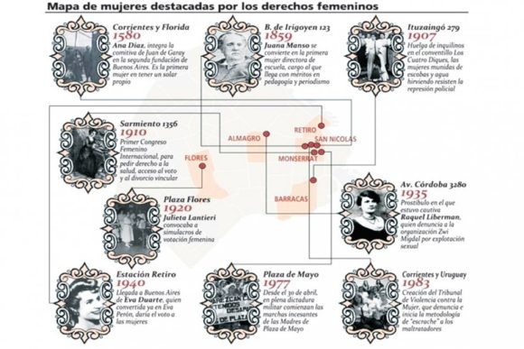 Una cartografía feminista en marcha creada por el colectivo Mujeres Públicas con la colaboración de la historiadora del Conicet Andrea Andújar, permite recorrer la capital argentina descubriendo espacios públicos donde las mujeres accionaron en defensa de sus derechos en los últimos 200 años.