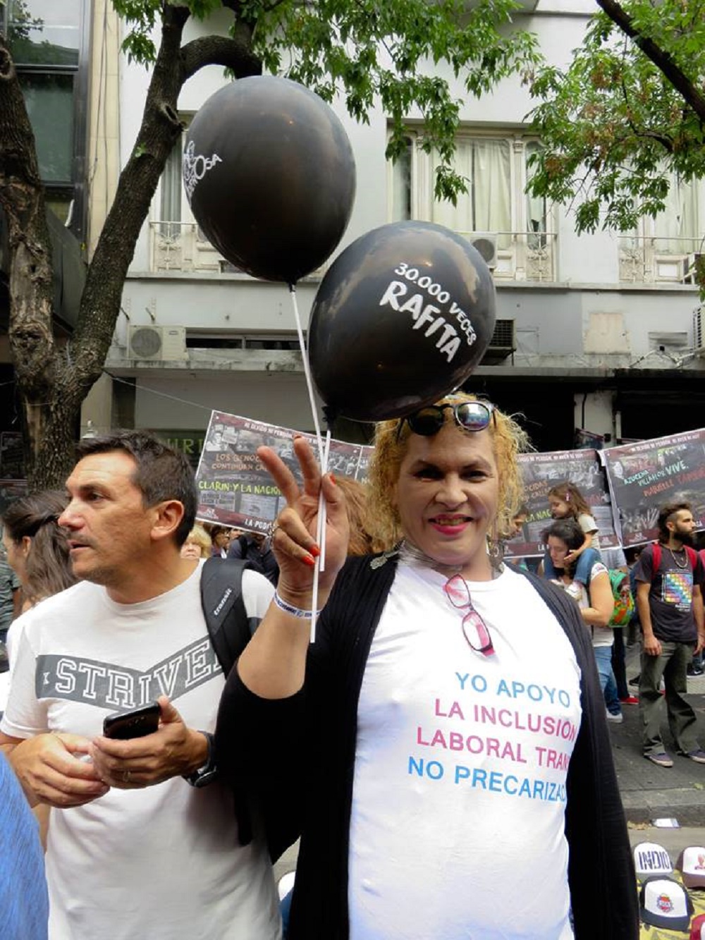 Tiene puesta una remera blanca donde se lee, en letras celestes y rosas: “Yo apoyo la inclusión laboral trans. No a la precarización”. Lleva en la mano dos globos negros, de esos que en la otra esquina reparte La Garganta Poderosa: “30.000 veces Rafita”, dicen -hacen referencia al joven mapuche Rafael Nahuel, ejecutado por la espalda por la Prefectura nacional en la provincia de Neuquén el años pasado-. Ella habla con toda la suavidad que su voz le permite: “Nosotras también tenemos derechos, por eso estoy aquí. Para visibilizar a las 400 de personas trans desaparecidas durante la última dictadura militar”, explica.