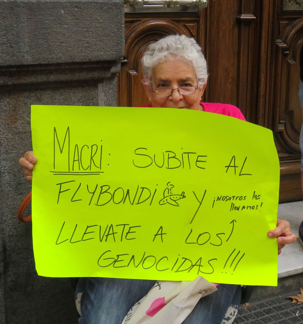 “Pasa que me duele el país”, dice una mujer munida de una cartulina amarilla donde escribió en letras mayúsculas: “Macri subite al Flaybondi y llévate a todos los genocidas” y hasta se tomó el trabajo de dibujar un avioncito. Está sentada en el umbral de una puerta con el cartel abierto. “No puedo caminar -dice-, tengo flebitis y apenas me sostengo, pero vine porque sé que tengo que estar. Soy una de las víctimas de este Gobierno, me recortaron la jubilación, el dinero no me alcanza para nada ¡Antes los milicos! ¡Ahora éstos! ¿Vos crees que no son lo mismo?”.