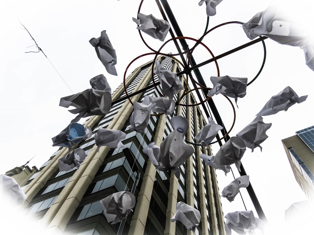 Una corona de pañuelos blancos cuelga del semáforo de Chacabuco y avenida de Mayo, parece un llamador de ángeles tamaño big size. Es un llamador de Madres, todos nos detenemos bajo esos pañuelos, los queremos capturar en nuestras retinas. Constituyen una simbología de una belleza tan particular como el significado que tienen. Son ellas danzando, circulando, luchando, pariendo mil hijos.