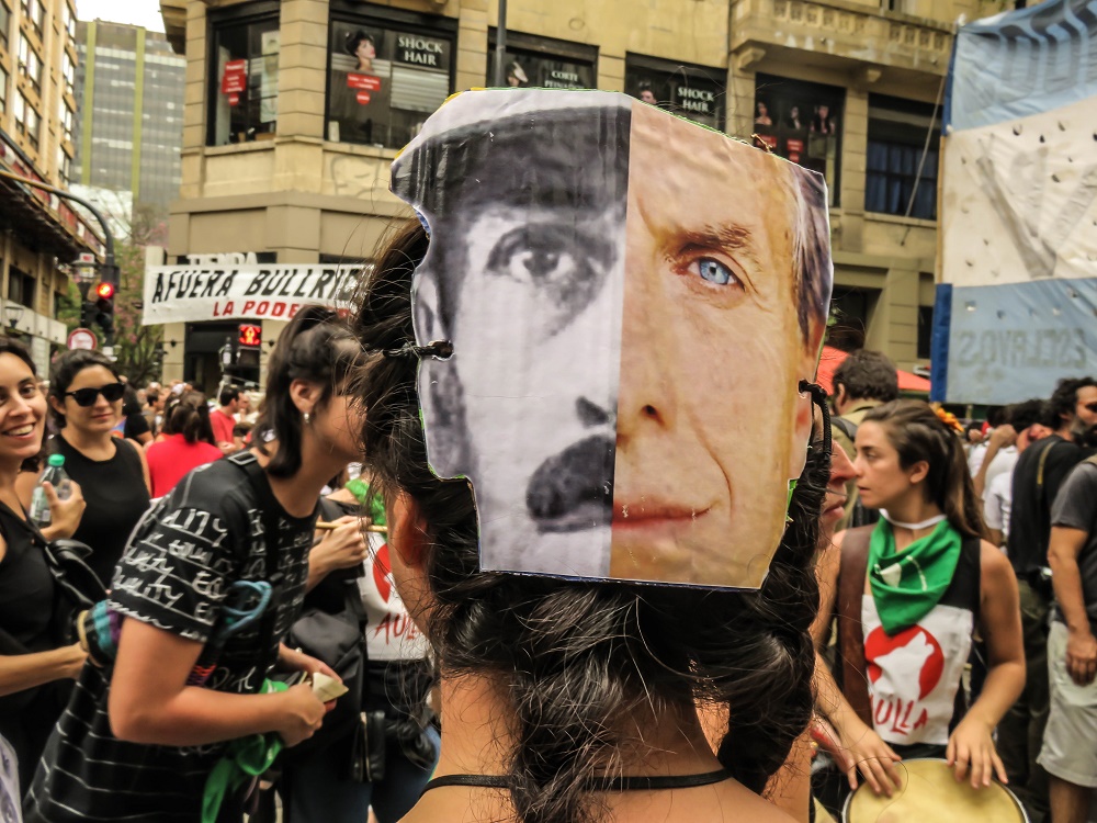 Al costado de la marcha, una mujer porta un pañuelo dibujado en un cartón y sostenido con una varilla, sonríe emocionada al ver la multitud. Ella es de las tantas personas que llegan a la marcha por cuenta propia. “Siento que tengo que estar”, dice y sonríe para la foto. En el centro un grupo de jovencitas llevan caretas colgadas de la nuca. Medio rostro de Macri se complementa con medio rostro de Videla.
