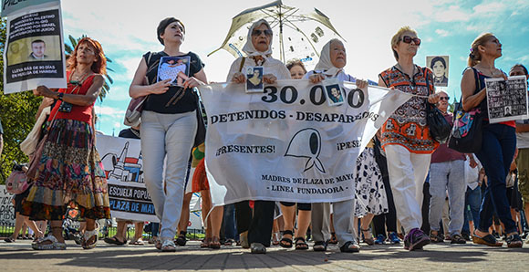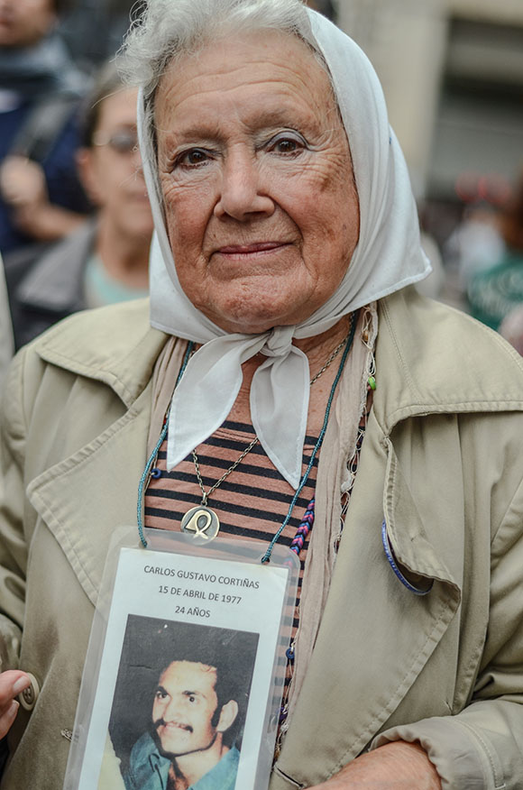 15.30. Mirta y Nora se alistan para ir a la plaza. Salimos a la calle; el calor ha cedido un poco, una brisa fresca llega desde el río. Camino junto a ellas; sus pasos son firmes, raudos. Llevan en las manos los pañuelos con el nombre de sus hijos. Como en una ceremonia, al ingresar a la plaza los colocan en su cabeza. Caminamos hacia la pirámide. La ronda es nutrida. Marchan mujeres, niños, hombres, representantes de asambleas ambientales, de pueblos originarios, activistas, artistas, estudiantes… Las Madres fueron un semillero. Marchan, no sólo por los 30.000. Marchan por nosotros. Persiguen Justicia.