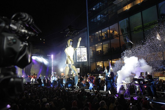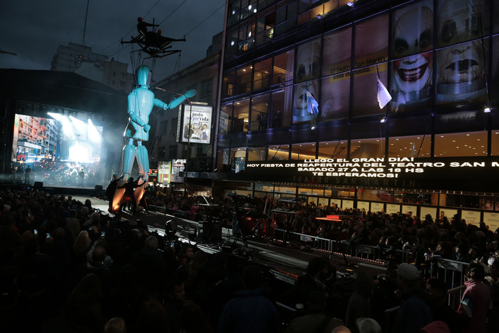 Pasadas las 19 hs. crecía el frío y empezó una obra de marionetas de Pichón Baldinú. El jefe de Gobierno Larreta, el ministro de Cultura Ángel Pititto Mahler y el director del Teatro San Martín Jorge Telerman miraban probablemente a resguardo desde los pisos altos y vidriados del edificio vedado. Las marionetas hablaban como payasos, la música era de estruendo, las luces encandilaban, se multiplicaban los personales, la gente cubría la avenida. De pronto cambió la música, se amontonaron las marionetas y comenzaron a extraer un objeto del     escenario. Tras la expectación, lo que surgió fue un muñeco robot gigante de diez metros de altura. La música tornó a tecno ensordecedor y el muñeco se movió. Tenía por cabeza un televisor que emitía imágenes. Las imágenes era de la película 1984 -de la novela de Orwell-. El muñeco gigante dio unos pasos hacia Callao. En la cabeza se veía por momentos el rostro del Gran Hermano, ese hombre de bigote y mirada penetrante, la imagen se convertía en una boca y también en un ojo enorme que nos miraba. El muñeco parecía caminar sobre la gente, pisándola. Era una pesadilla. La cultura del Gran Hermano, de la opresión y el control. Todo lo contrario al afán emancipador de San Martín.
